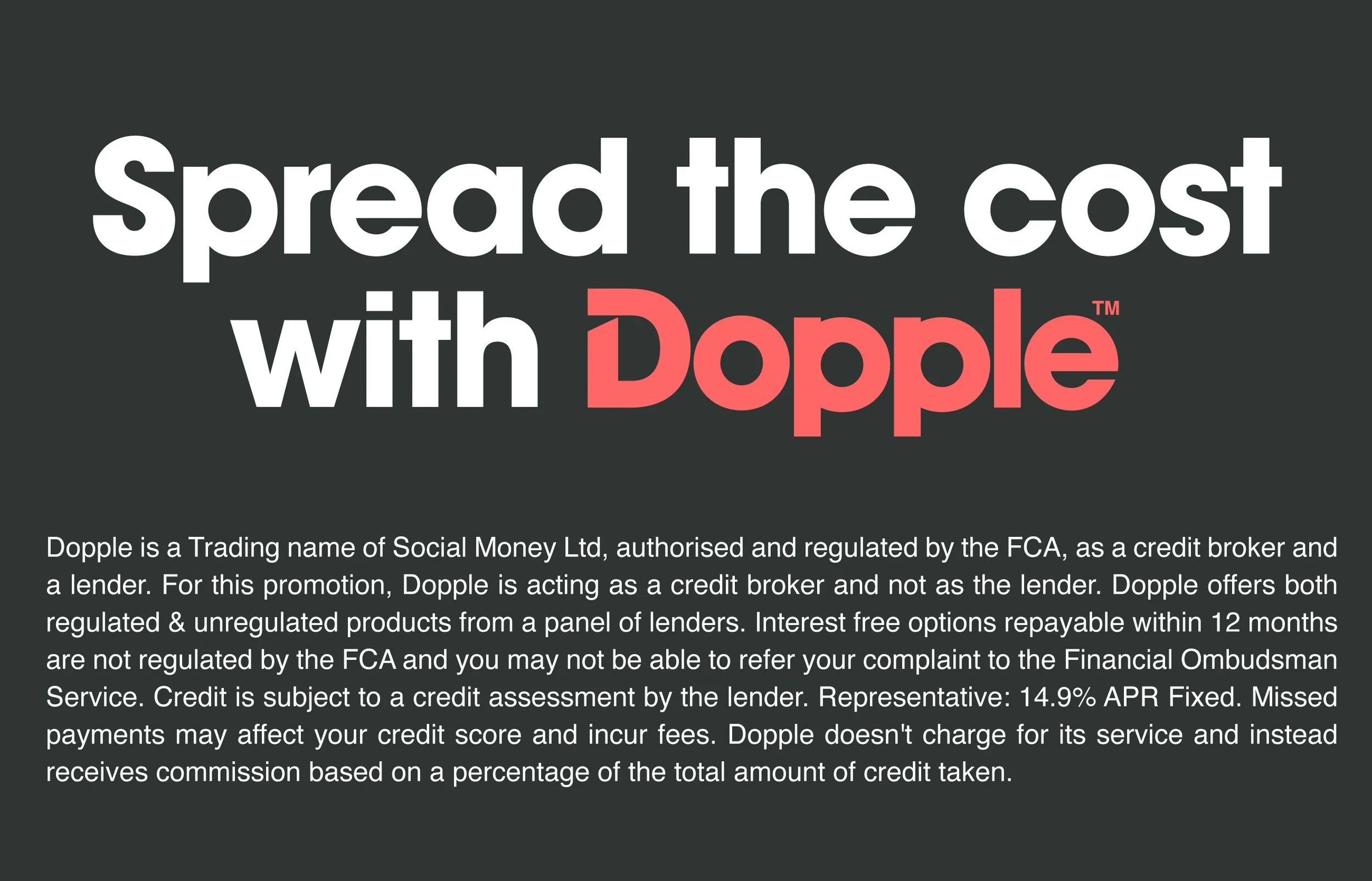 Credit is provided by Klarna, and once available, Dopple Pay, and is subject to status, affordability checks, and their respective terms and conditions. We are not a lender and do not make credit decisions.